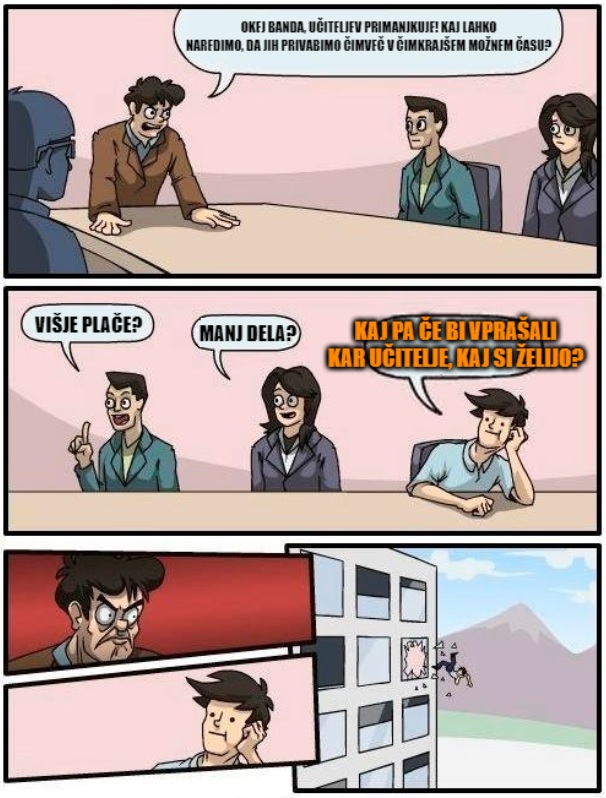 Priznajmo si, učitelji smo čuden profil ljudi. Mi uživamo, ko nam mularijad vzdihuje od dolgčasa in čaka, da nehamo nakladat in jim damo mir, ker imajo čez 15 minut kontrolko iz čisto druge snovi. Še več, mi si tega želimo še bistveno več. Nam je to izziv in poslanstvo. Za to bi bili pripravljeni vzeti tudi manjšo plačo, tudi več učencev, tudi slabšo infrastrukturo. Vse dokler nam nihče izven razreda ne serje po glavi. Konstantno. Starše in politike iz šol pa bo začuda tudi dovolj učiteljev.
